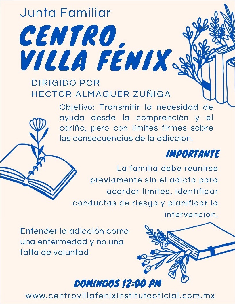 "Junta Familar"... *Informar a la familia sobre la naturaleza de la adicción (cómo funciona, sus efectos físicos, emocionales y sociales). 📚 *Romper el silencio y la negación que muchas veces rodea el tema.🤐 *Fortalecer la red de apoyo, mostrando al paciente que no está solo.🤝 *Definir límites y acuerdos, para evitar conductas que puedan reforzar el consumo (por ejemplo, encubrir o justificar).🛑 *Motivar al tratamiento, ayudando a la persona a reconocer la necesidad de buscar ayuda profesional.🌱 #CentroVillaFénix #HectorAlmaguerZuñiga #Centro #Adicciones #Junta #Familiar